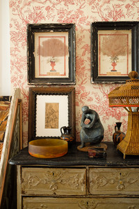 Friends of my parents used to run a wonderful hotel on Sylt, and when they sold it, I was allowed into their storage of wallpapers and fabrics. Over decades they collected designs from Colefax & Fowler, Liberties, GPJ & Baker, Pierre Frey etc. I picked two leftover wallpaper designs- one GPJ & Baker Passion Toile in red and a floral pattern by Les Olivades. I was determined to add the rolls of wallpaper to my new place, but I've never really been a fan of the ‚one wall wallpaper look', and there wasn't enough to decorate a whole room. One day my dad (my interior hero) came to visit. He sat in the living room and said, 'This is such a beautiful room; it's a real shame about those doors [that separate the living and the dining area]. Why don't you use the wallpaper on them? "I was immediately jealous that I hadn't thought of that idea myself... I put the Passion Flower Toile on, and I absolutely love it. I used the rest on a small plastered wall that is hiding an old entrance. I had the front room painted in a deep turquoise by Paint & Paper
