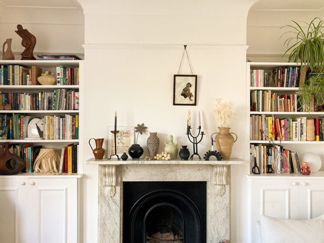 The flat is centred around the living/dining room, which is the biggest and most impressive. Mimi chose it because she liked the vast bay windows, which flood the room with light and the original features like the marble mantelpiece, which is pretty handy for me to use for Mantel too. In the living room, there's a mix of both of our books, objects and furniture. This room gets a lot of use as I work from home, so it doubles as a warehouse and photography studio while also having to keep its original use as a living area and dining room! We haven't been here long, so the kitchen is still in need of renovation as it is pretty dated and doesn't fit the rest of the flat.